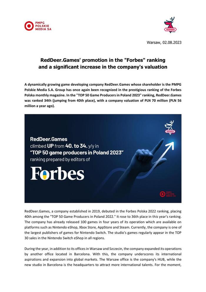 2023 08 02 RedDeer Games' promotion in the Forbes ranking and a significant increase in the company'